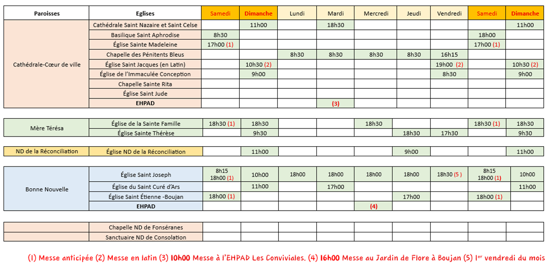 Horaires des Messes et Annonces Horaires du s.28 février au d.8 mars 2026 Chemins de Croix VENDREDIS DE CAREME à15h Chemin de Croix. 6 Mars à St Nazaire et Celse ; 13 Mars à ND de la Réconciliation ; 20 Mars Ste Famille ; 27 Mars à Ste Thérese. Eglise St Jacques 19h Tous les vendredis (sauf le 27/02) messe en latin, 19h45 chemin de croix. Église St Joseph tous les vendredis à 15h GRAND CHEMIN DE CROIX NOCTURNE DE LA VILLE Vendredi 27 Mars de 20h30 à 21h30. De la chapelle des Pénitents à la Cathédrale Sts Nazaire et Celse. VOIR les horaires dans toutes les paroisses proches (Messes.info) — Toutes les annonces de la semaine ICI Paroisses de l’Ensemble Saint Guiraud ICI Pour recevoir le pardon de Dieu, Jours de la semaine et heures Trouver une paroisse ou une église à Béziers Paroisse Bonne Nouvelle ICI Lectures et homélie de dimanche dernier et lectures de ce dimanche France 2 : Messe télévisée le dimanche à 11hRadio : Messe à 10h sur RCF et France Culture