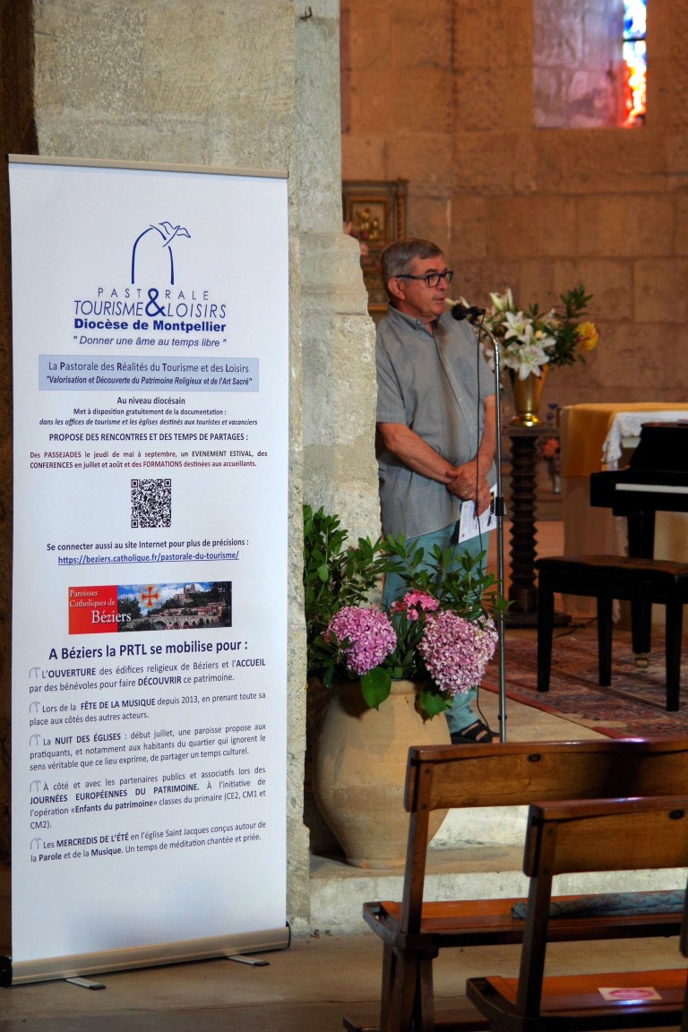 C’est au titre de référente de la Pastorale du Tourisme de l’église Saint Jacques que je m’adresse à vous, en soulignant que des bénévoles se relayent pendant la période estivale afin que cet édifice soit ouvert au public les lundis et vendredis après-midi et tous les mercredis de l’été. J’indique par ailleurs que par la volonté de Mr le Maire, lorsque l’église est fermée, il est possible depuis le 14 juin 2017, grâce au concours de la ville de Béziers, qui a fait réaliser et poser une grille, de découvrir l’intérieur de l’édifice et le somptueux chœur, depuis le portail ouest, accessible sur le côté depuis le jardin à partir du 1er avril jusqu’au 31 octobre. L’église sera ouverte durant toute la semaine Jacquaire du 17 au 25 juillet de 10h à 18h afin de permettre, nous l’espérons, à de nombreux visiteurs d’apprécier l’esprit de parcours, mais aussi pour d’autres, à se mettre en chemin …
