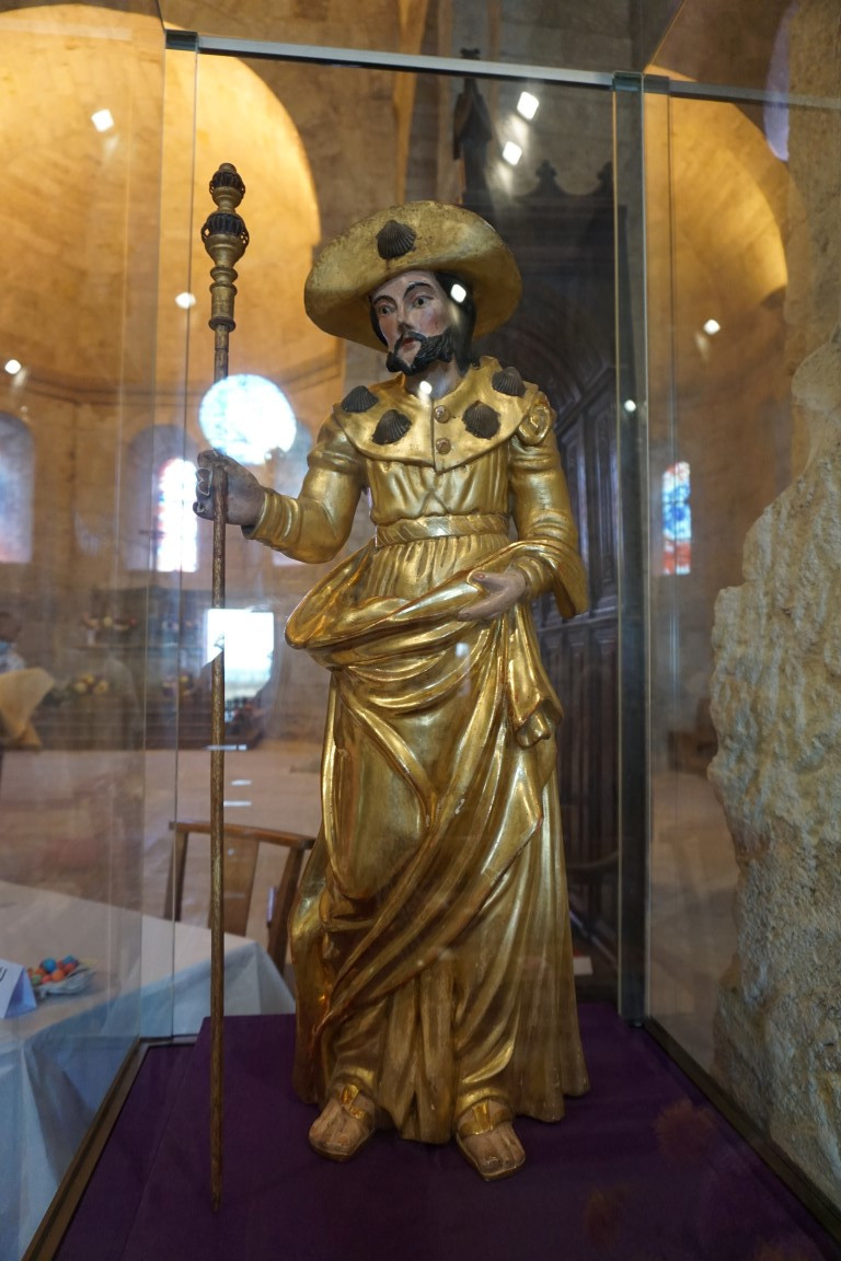 Né en Galilée, 5 à 10 ans avant Jésus-Christ, Jacques était le fils de Zébédée et de Marie-Salomé. La place prépondérante que Jacques tient auprès de Jésus est due non seulement au fait qu’il a fait partie de ses premiers disciples, mais également à son caractère. Le Nouveau Testament décrit un homme « passionné, audacieux, ambitieux et décidé ». Les Actes des Apôtres racontent qu’il reçoit le Saint Esprit sous la forme de langues de feu lors de l’épisode de la pentecôte (vers l’an 33). C’est à partir de ce moment-là qu’il va prendre son bâton de pèlerin et parcourir les chemins pour évangéliser l’occident. D’après la légende, Jacques traversa la Méditerranée pour prêcher le christianisme en Espagne, vers l’an 44, il est arrêté par ordre du roi de Judée, Hérode Antipas 1er, qui le fera décapiter devenant ainsi le 1er apôtre martyr. Ses disciples auraient alors recueilli sa dépouille pour la déposer dans une barque, qui aborda en Galice, à Padrón. Le corps fut enterré dans un compostum, c’est-à-dire un « cimetière » (telle est l’une des étymologies du nom de « Compostelle ») et resta ignoré jusqu’à ce qu’au début du IXème siècle, le 25 juillet 813, une étoile vînt indiquer à un ermite du nom de Pelayo (Pélage) l’emplacement de la sépulture. Ce lieu appelé dès lors campus stellae ou « champ de l’étoile » aurait donné, selon une autre étymologie plus poétique, le mot « Compostelle ». Alphonse II érigea, à côté du tombeau, une église et un monastère. C’est autour de ces édifices primitifs que fut érigé l’actuelle « Catedral de Santiago de Compostela », où convergent les pèlerins.