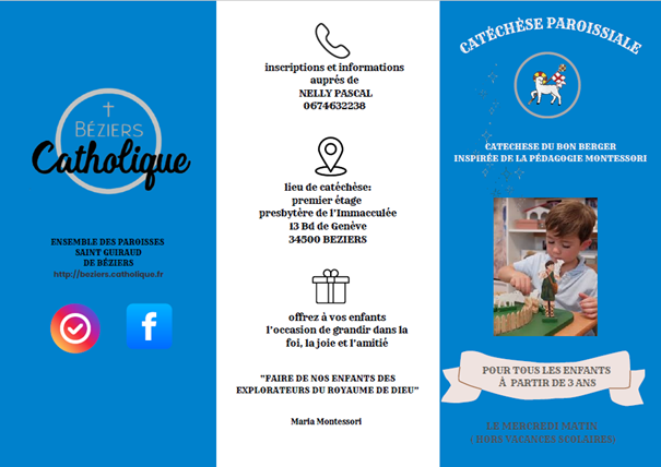 il y a à Béziers quatre lieux d’éveil à la foi (maternelle, CP, CE1) et de catéchèse (CE2, CM1, CM2)