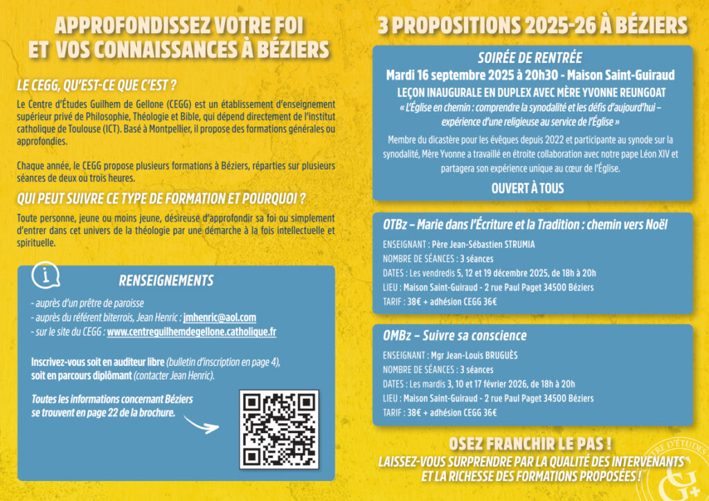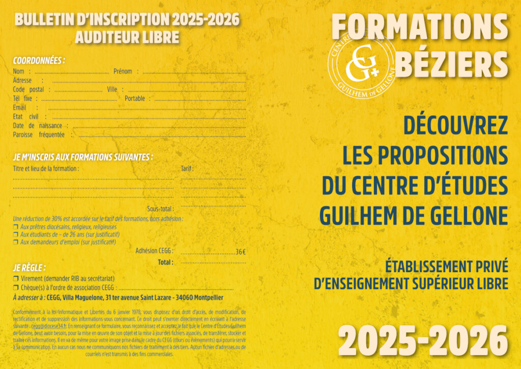 Les inscriptions sont ouvertes pour le second semestre, vous pouvez contacter le secrétariat dès à présent pour vous inscrire : cegg@diocese34.fr