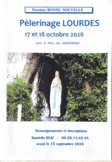 PELERINAGE à LOURDES de la Paroisse Bonne Nouvelle – Samedi 17 et dimanche 18 octobre, accompagné par le Père Jan Jankowski : Renseignements auprès de Danielle Ruiz au 06 20 13 62 48. L’inscription peut se faire dès à présent et avant le 15 septembre.