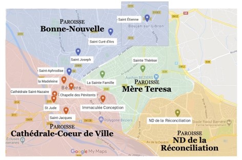 Paroisses et Églises de Béziers Pour trouver votre paroisse ou une église proche de chez vous, cliquez / zoomez sur la carte (puis pointez sur la carte ou sélectionnez le nom d’une église dans la marge) Cliquez sur la Paroisse que vous aimeriez connaître Ensemble des Paroisses St Guiraud Paroisse Bonne Nouvelle